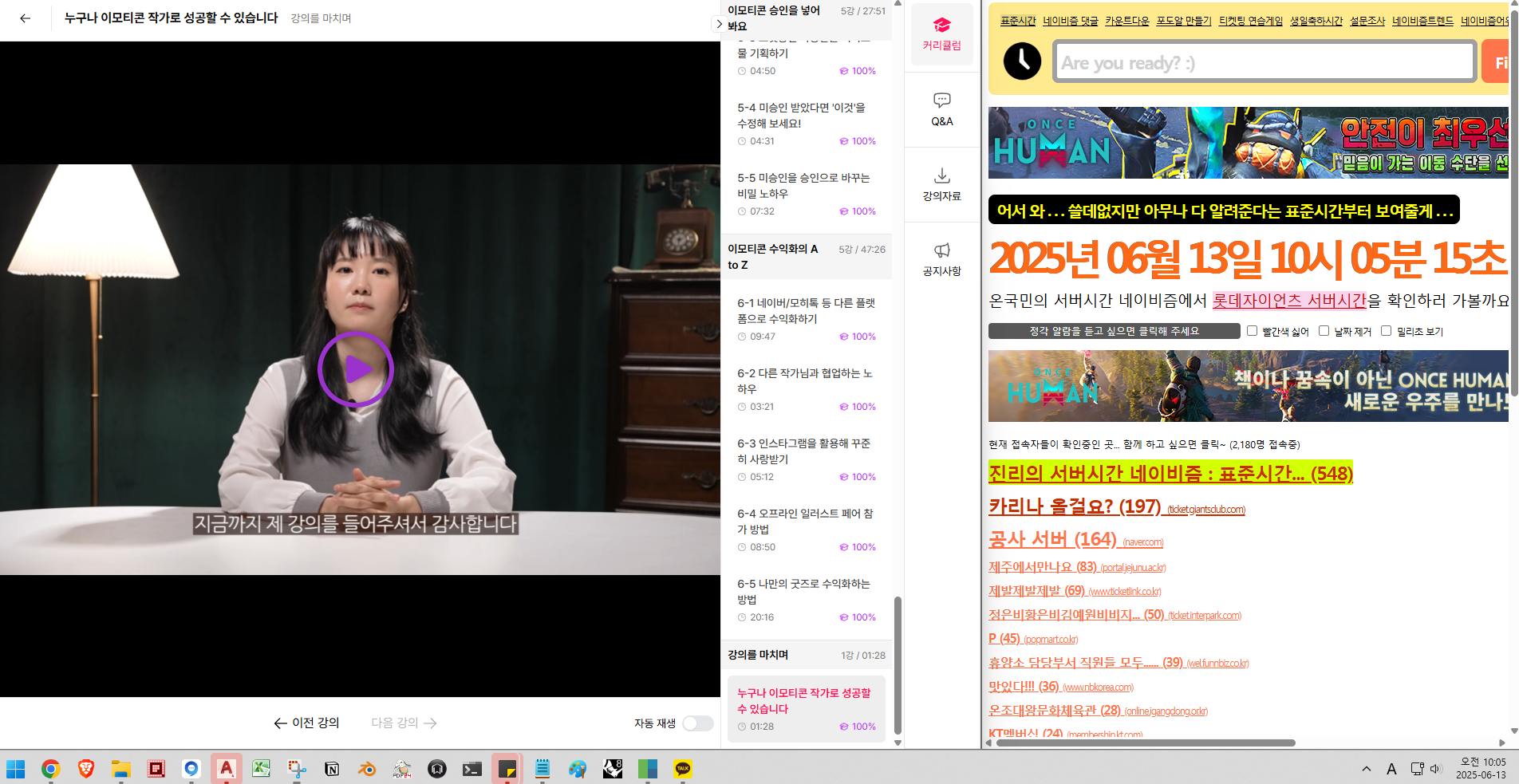 누구나 이모티콘 자가로 성공할 수 있습니다 / 완강했다. 참 길었고 짧았던 수강 기간이었다. 카카오톡 이모티콘을 제출했는데 결론은 낙방이었다. 강사님께 피드백을 받아서 다시 제출해볼 예정이다. 생각보다 고배를 마신 것이 쓰진 않았다. 뭔가 살짝 내려 놓은 느낌이라서 그런 것일까... 자주 마시면 점점 쓴 맛이 올라올 것 같지만 아직은 내가 부족한 것도 알고 이 시장을 쉽게 비집고 들어갈만한 실려(?)을 갖추지 못했다고 생각하기 때문이다. 아이디어는 잘 다듬으면 좋을 것 같은 느낌이긴하다만... 아무튼 완강까지 그리고 이모티콘 제안까지 하게 만들어준 탈잉과 김나무 이모티콘 작가님께 감사를 전한다. 생각만 하고 있다가는 아무것도 이뤄지지 않는 것인데 챌린지를 통해서 동기부여와 한 스탭씩 밟아 나가는 것이 이 강의 장점이라고 생각된다. 마지막 강의를 사실 따로 리뷰 미션이 없지만 강의를 끝까지 들은 나를 위한 마지막 리뷰인 셈인데 피드백 제출 이후 또 남기고 싶은 이야기가 있다면 짧게 남겨보도록 할 예정이다. 지금까지 강의를 열심히 들어준 게으른 나와 끝까지 함께해준 김나무 강사님, 땡큐!
